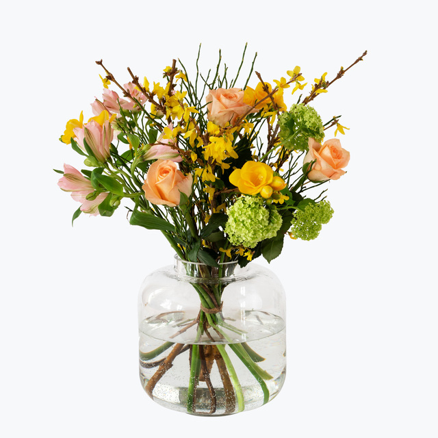 Vakker bukett med en herlig miks av vårens blomster i fargenyansene fersken, rosa, gult og syrlig vårgrønt. Ved valg av større bukett legges det til flere blomster og mer grønt. En flott hilsen som passer til alle anledninger og vil spre blomsterglede til den heldige mottakeren.